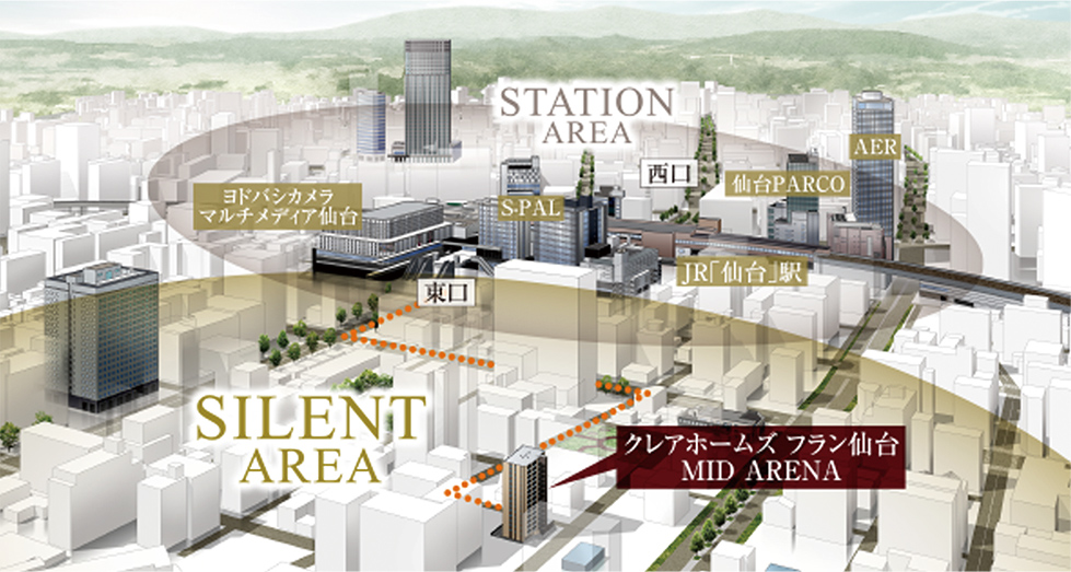 ※9:ファミリーマート 仙台二十人町店(徒歩1分/約70m)、市立榴岡小学校(徒歩3分/約210m)、ザ・ビッグエクスプレス仙台駅東店(徒歩5分/約330m)※掲載の距離表示は現地からの概測です。※徒歩での所要時間は80mを1分として算出し、端数を切り上げています。※掲載の外観完成予想CGは、計画段階の図面を基に描き起こしたもので実際とは多少異なります。なお、外観の細部及び設備機器等は一部省略または簡略化しております。※掲載の現地周辺概念イラストは地図等を基に描き起こしたもので、実際とは道路の形状、建物の位置関係、サイズ、距離等は異なります。また、周辺環境は将来にわたって保証されるものではありません。※掲載の写真は全てイメージです。